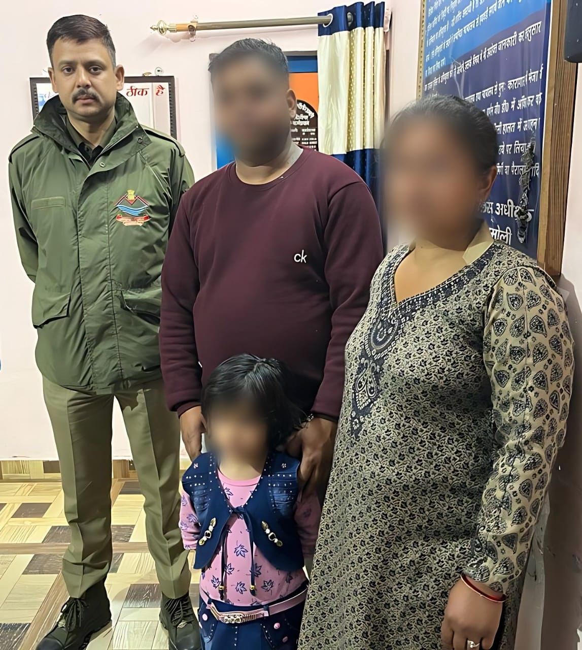 दिनांक 21.11.23 की सांय को श्री संजय निवासी जोशीमठ ने गौचर मेला चौकी में तैनात अ0उ0नि0 प्रदीप राणा, हे0कानि0 अशोक व कानि0 कमलेश सजवाण को सूचना दी की उनकी बेटी समायरा उम्र 6 वर्ष गौचर मेले में बिछड गई है। जिसकी उनके द्वारा काफी तलाश की गयी लेकिन उसका कुछ पता नहीं चल पाया है। बच्ची की माता जी द्वारा भावुक होकर पुलिस कर्मियों से बच्ची की ढूँढने हेतु सहायता मांगी गयी, जिस पर पुलिस कर्मियों द्वारा तत्परता के साथ सम्पूर्ण गौचर मेला क्षेत्र एवं कस्बा गौचर बाजार में बच्ची की तलाश की गयी तो 03 घंटे की कड़ी मेहनत एवं पुलिस कर्मियों के अथक प्रयासों से नन्हीं समायरा को जीएमवीएन गेस्ट हाउस गौचर के पास से सकुशल बरामद कर उसके परिजनों के सुपुर्द किया गया। अपनी बेटी के सकुशल मिलने पर परिजनों द्वारा चमोली पुलिस की तत्परता से की गई कार्यवाही का आभार व्यक्त कर पुलिस कर्मीयों को धन्यवाद किया गया।