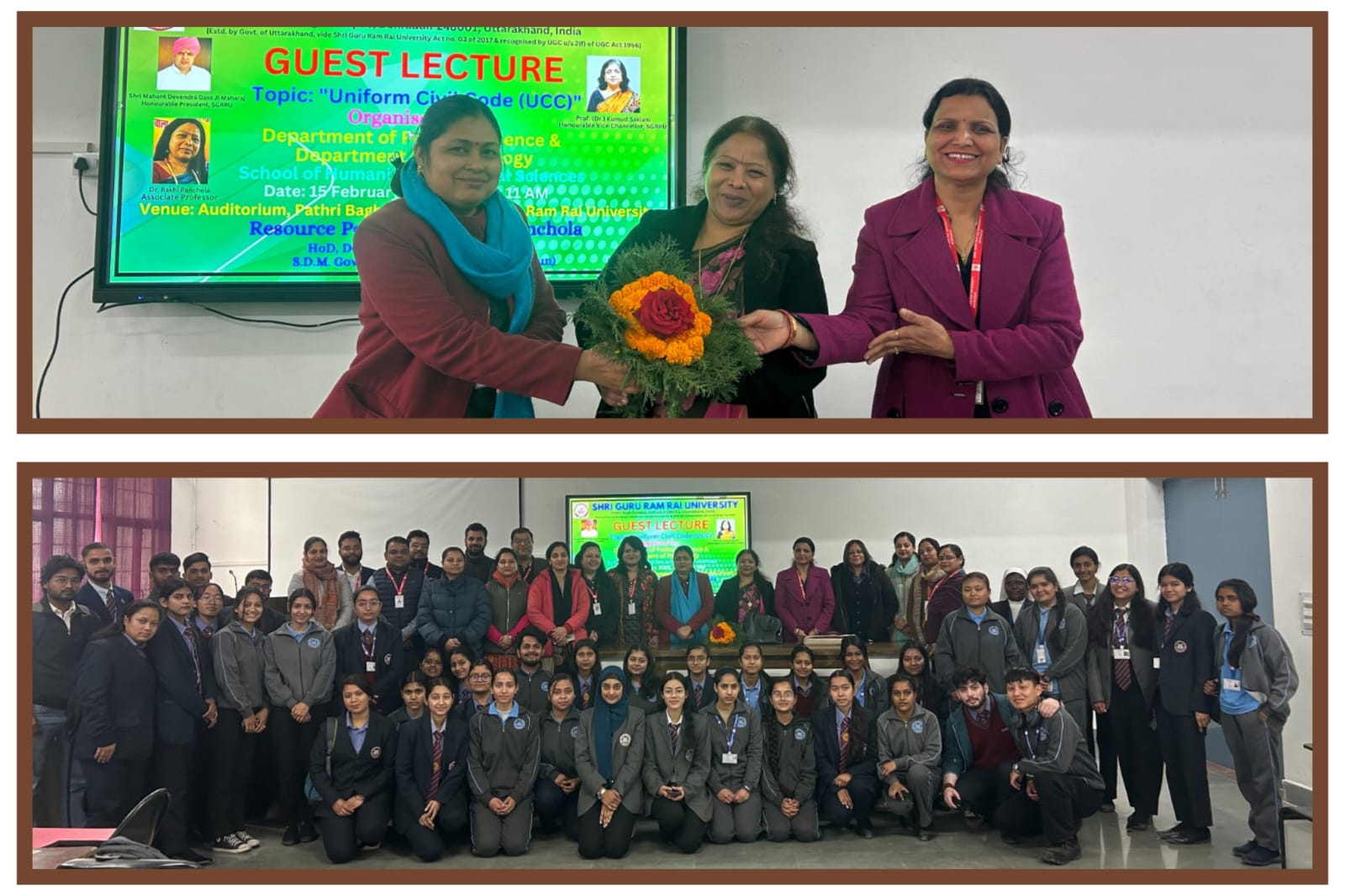 देहरादून।उत्तराखंड में समान नागरिक संहिता लागू होने के बादए राज्य में विवाहए तलाकए उत्तराधिकारए विरासत और लिव.इन संबंधों से जुड़े कानूनों में महत्वपूर्ण परिवर्तन हुए हैं। इस विषय पर एसजीआरआर विश्वविद्यालय में सामाजिक एवं मानविकी विज्ञान संकाय के राजनीति विज्ञान और मनोविज्ञान विभाग द्वारा विशेष संगोष्ठी का आयोजन किया गया। संगोष्ठी में मुख्य वक्ता के रूप में उपस्थित डॉण् राखी पंचोला विभाग अध्यक्षए  राजनीति विज्ञान विभागए एसडीएम गवर्नमेंट पीजी कॉलेज डोईवालाए ने अपने विचार साझा किए।